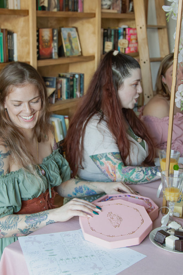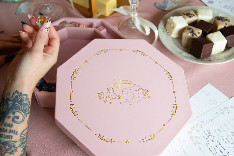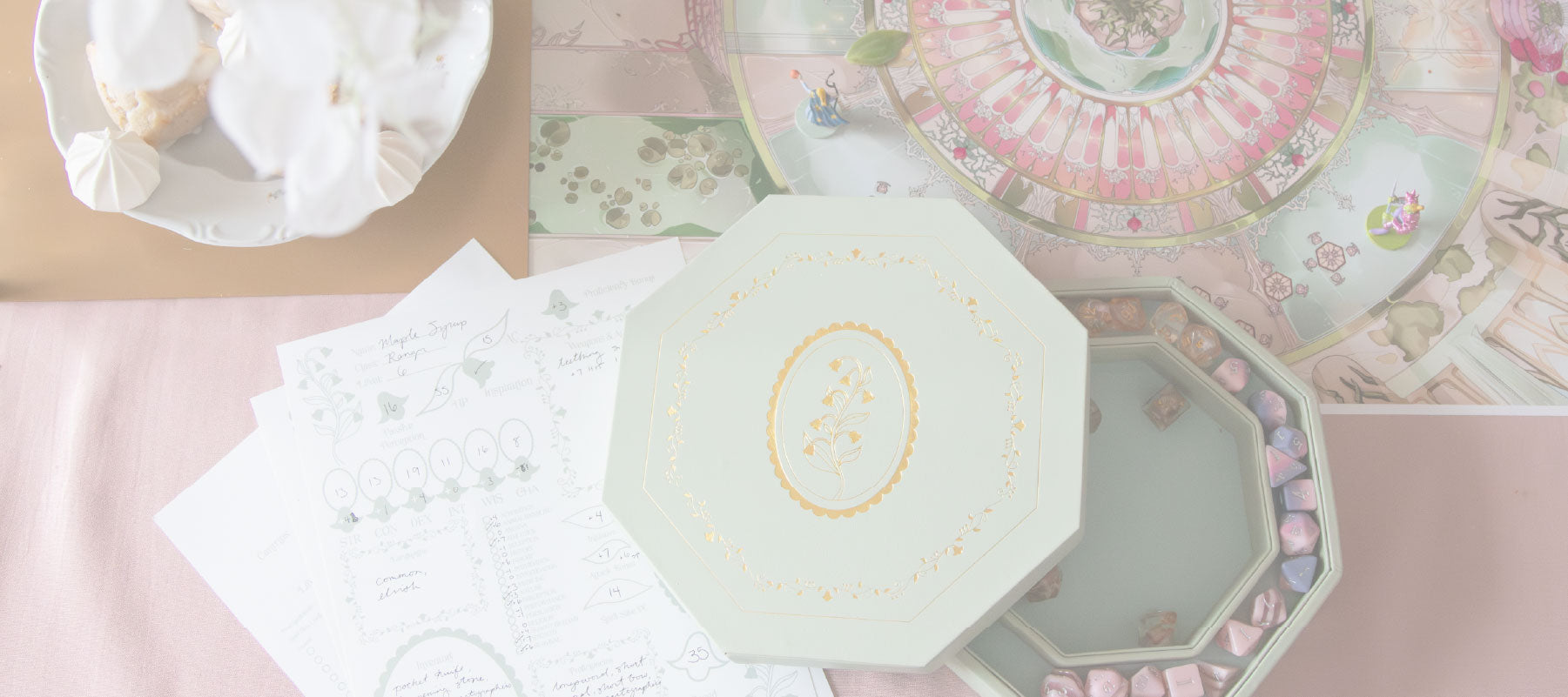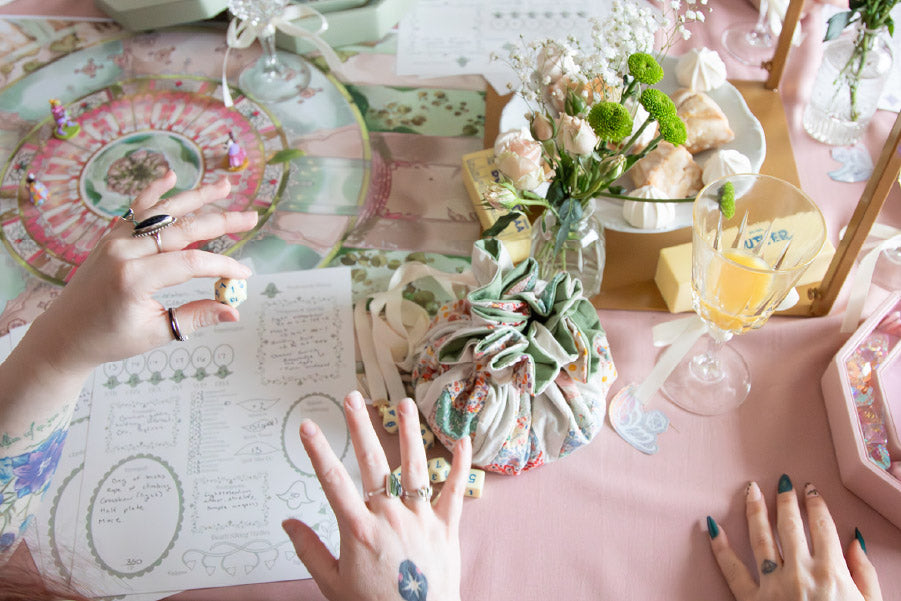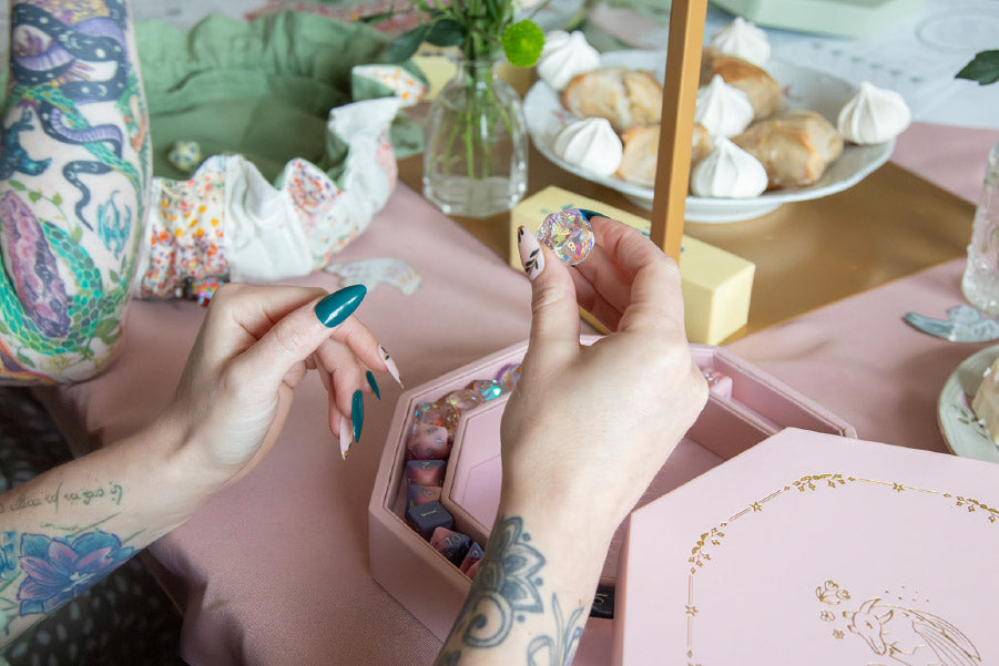 Hi! We’re Meg and Camielle, two TTRPG players who wanted accessories that matched our aesthetic. Red and black dragons are cool, but we wanted something different: soft, magical, fantastical, cottagecore tabletop accessories.