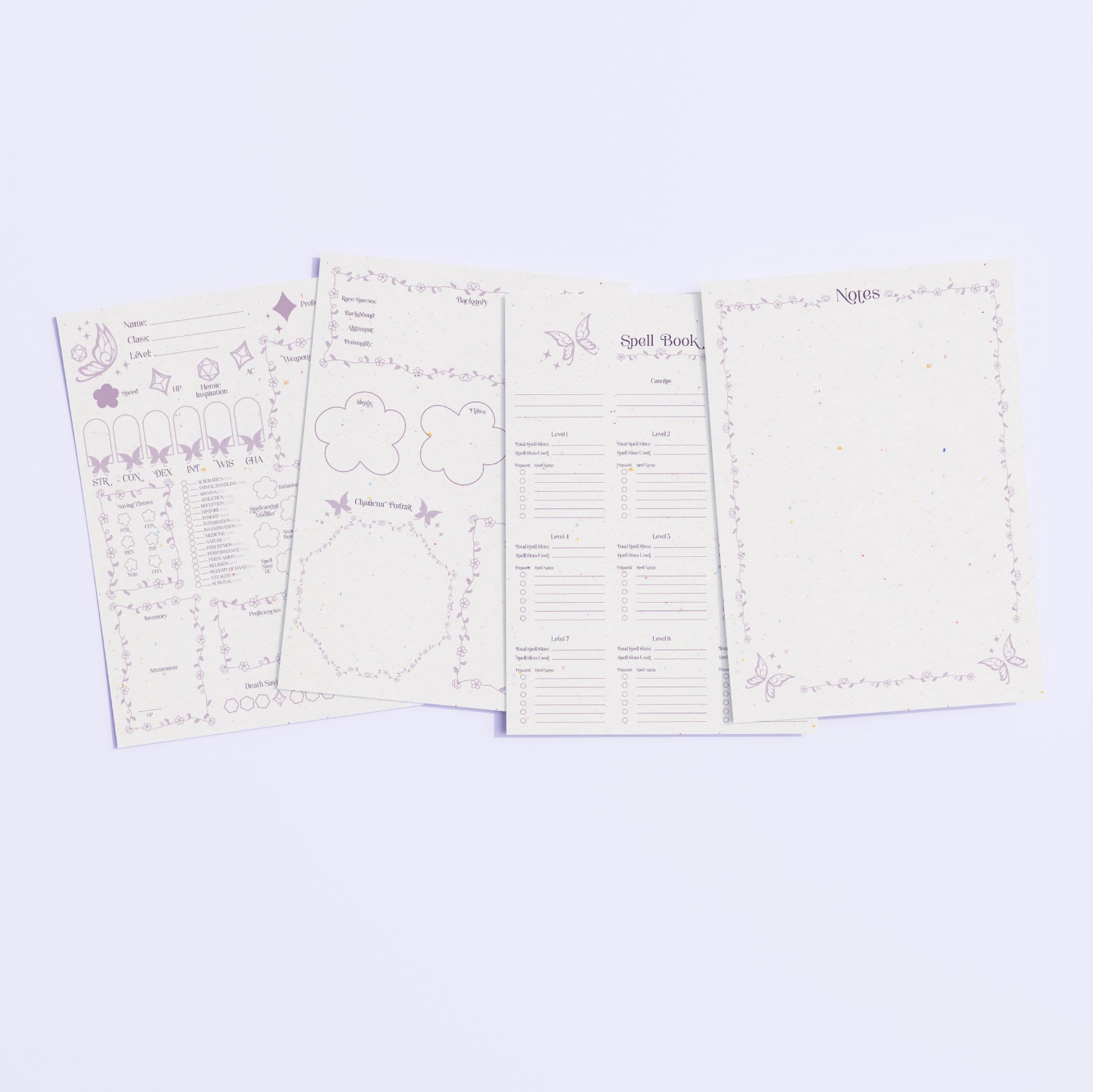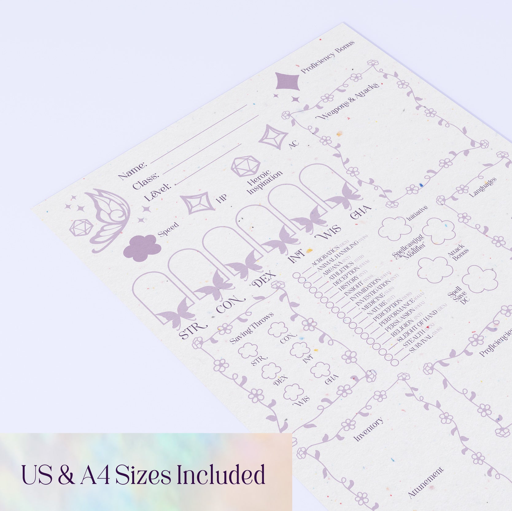 Bring a touch of magic to your tabletop adventures with the Fairy character sheet set! Featuring hand-drawn lilac fairies (our Girlypop Tabletop brand mark!) with d10s, d20s, and delicate botanical elements, this design adds whimsical charm to every roll. Designed to be both functional and enchanting, this set gives your character room to grow!